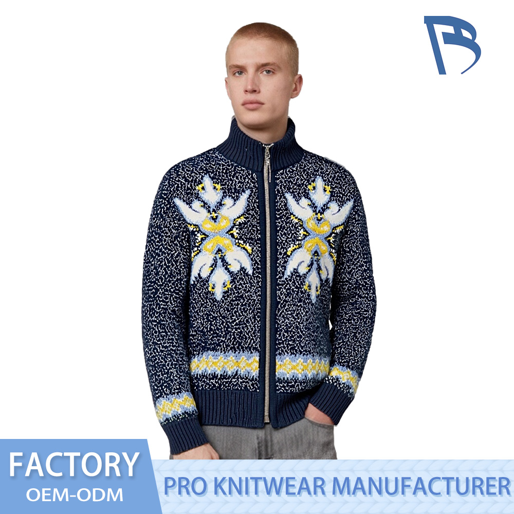 Chiếc áo cardigan giả cổ có dây kéo cụm hoa màu xanh hải quân này có phần đế dệt kim màu xanh nước biển lốm đốm tinh tế, được tô điểm trang nhã bằng họa tiết hoa jacquard cụm hoa đối xứng ở mặt trước. Được dệt tinh tế bằng các sợi màu trắng mềm mại và màu vàng ấm áp, các họa tiết phức tạp gợi lên kết cấu vượt thời gian của đường may vá cổ điển Châu Âu, tạo nên nét thẩm mỹ vừa hoài cổ vừa tinh tế một cách duyên dáng. Cổ áo giả có gân mang đến sự vừa vặn, tinh tế, ôm sát xương đòn đồng thời đảm bảo độ ấm, được tăng cường nhờ khóa kéo thực tế cho phép dễ dàng xếp lớp và tạo kiểu linh hoạt.